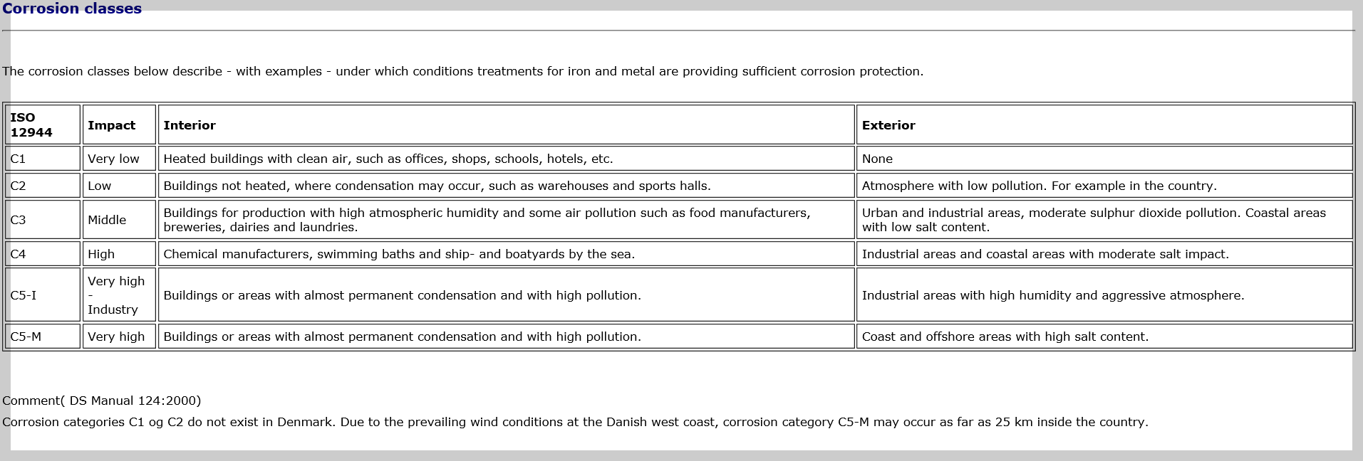 중간 부에 corrosive category(ISO 12944)에 대한 내용은 아래와 같다.
