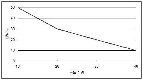 하지만 전동기의 수명을 좌우하는 여러 요인중에 가장 중요한 것은 전동기의 사용 온도, 더 자세히는 권선온도라 할 수 있습니다. 권선온도가 10도 높아 질 때 일반적으로 전동기 내부권선의 절연수명은 1/2로 줄어들게 된다고 볼 수 있습니다. 권선절연이 파괴되면 전동기는 더 이상 사용할 수 없게 되므로 전동기의 수명과 절연물의 수명을 대충 유사하게 보는 것도 이러한 이유에서 입니다.