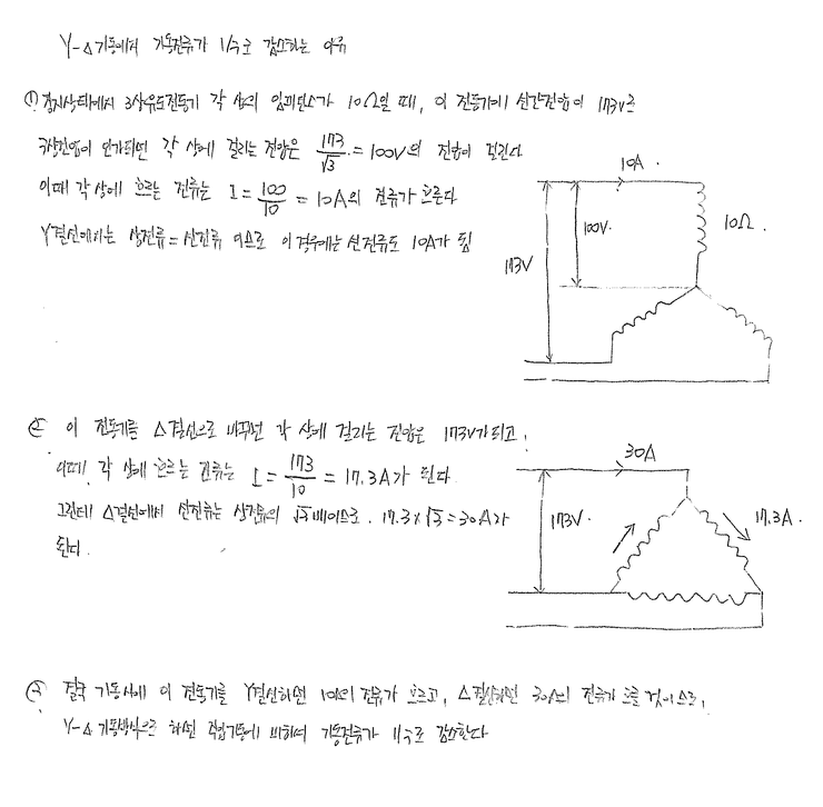 - 모터 코일을 이용하여 기동 시에 코일의 결선을 Y결선으로 시켰다가 운전 시에는 △로 결선이 되게하는 방법으로 모터가 기동하기 전에는 변압기와 같은 역할을 합니다. 결선을 Y로 바꿔주면 모터 코일의 저항이 3배로 커지는 효과가 있다. 기동전류는 모터에 따라서 다르지만 정격전류의 6~7배 정도 흐르게 되며, Y결선 시에는 직입기동 때보다 3배가 적게 흐르므로 정격전류의 2~2.5배 정도 흐르게 됩니다.