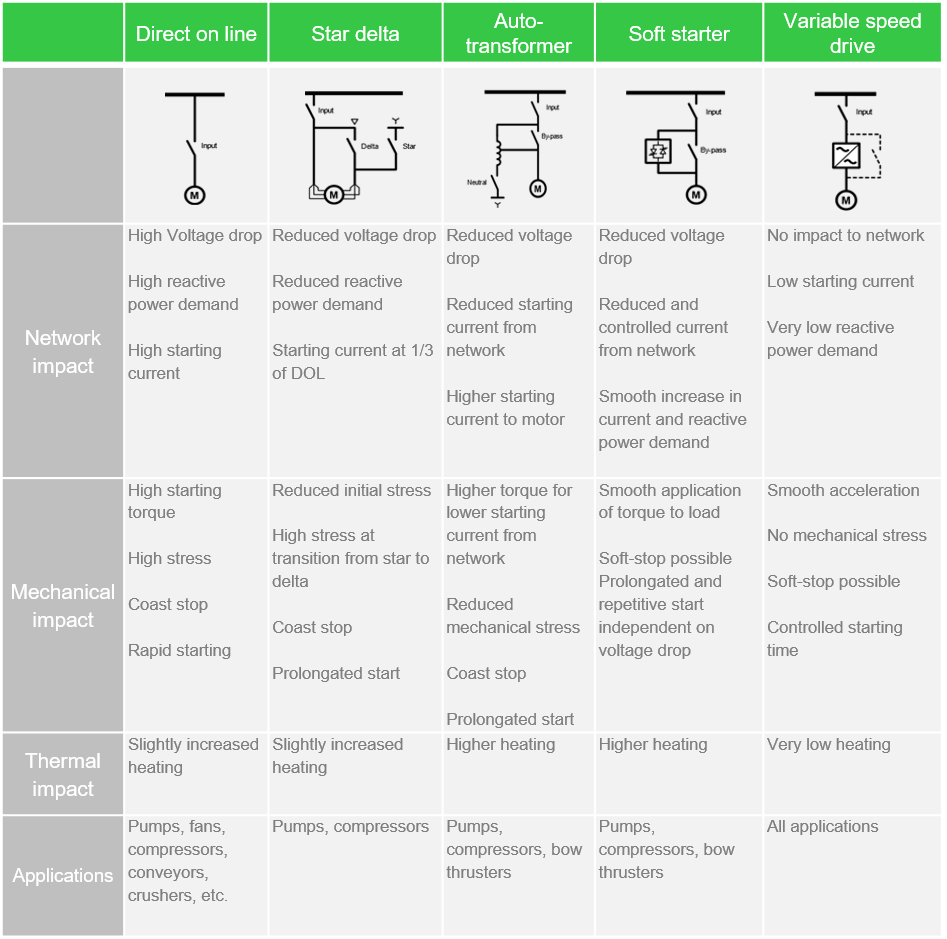 직입기동, Y-delta, 리엑터, 인버터, 컨버터 기동방식을 주로 사용합니다.